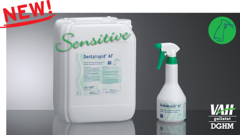 Dentalrapid AF Sensetive, özellikle alerjisi olanlar için tavsiye edilen, yeni, alkollü hızlı dezenfektandır.
