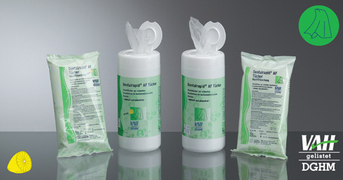 fenol, amin içermeyen, hızlı aktif olan, etkili ve güvenilir, nemli ıslak mendil. Tazelik kokulu, Dentalrapid AF ya da AF Lemon'lu imbibisyon likiti.